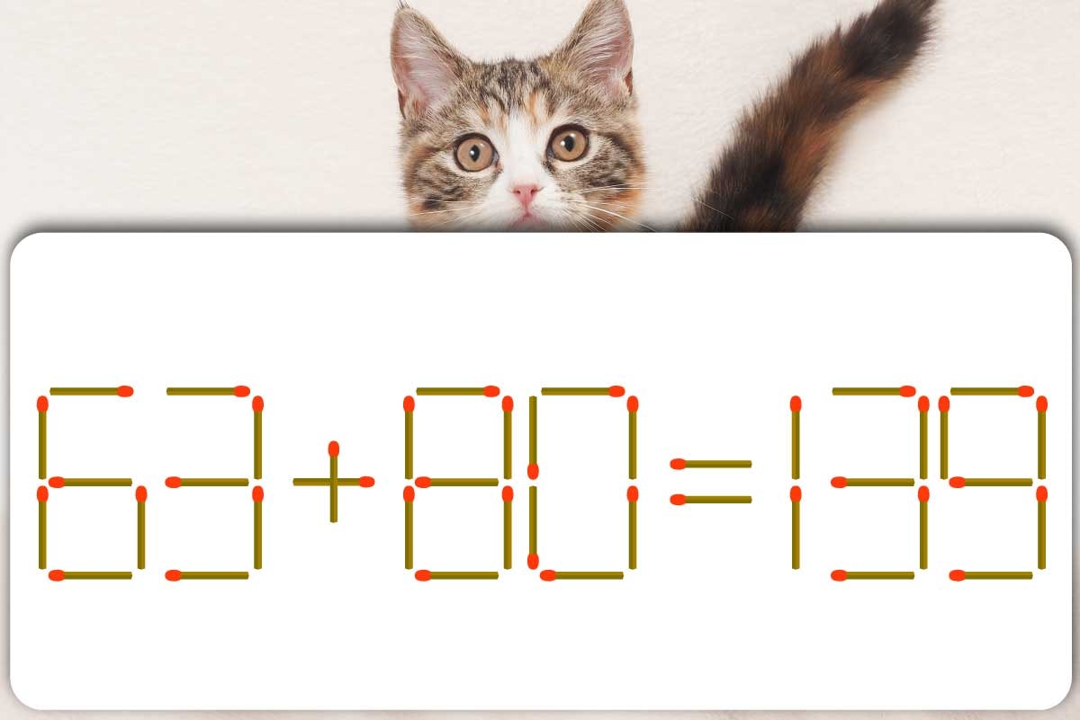 「6」の左下にあるマッチ棒を隣の「3」の左上に移動させて「9」を作り、「59+80=139」にする。※解答は複数ある場合があります。
