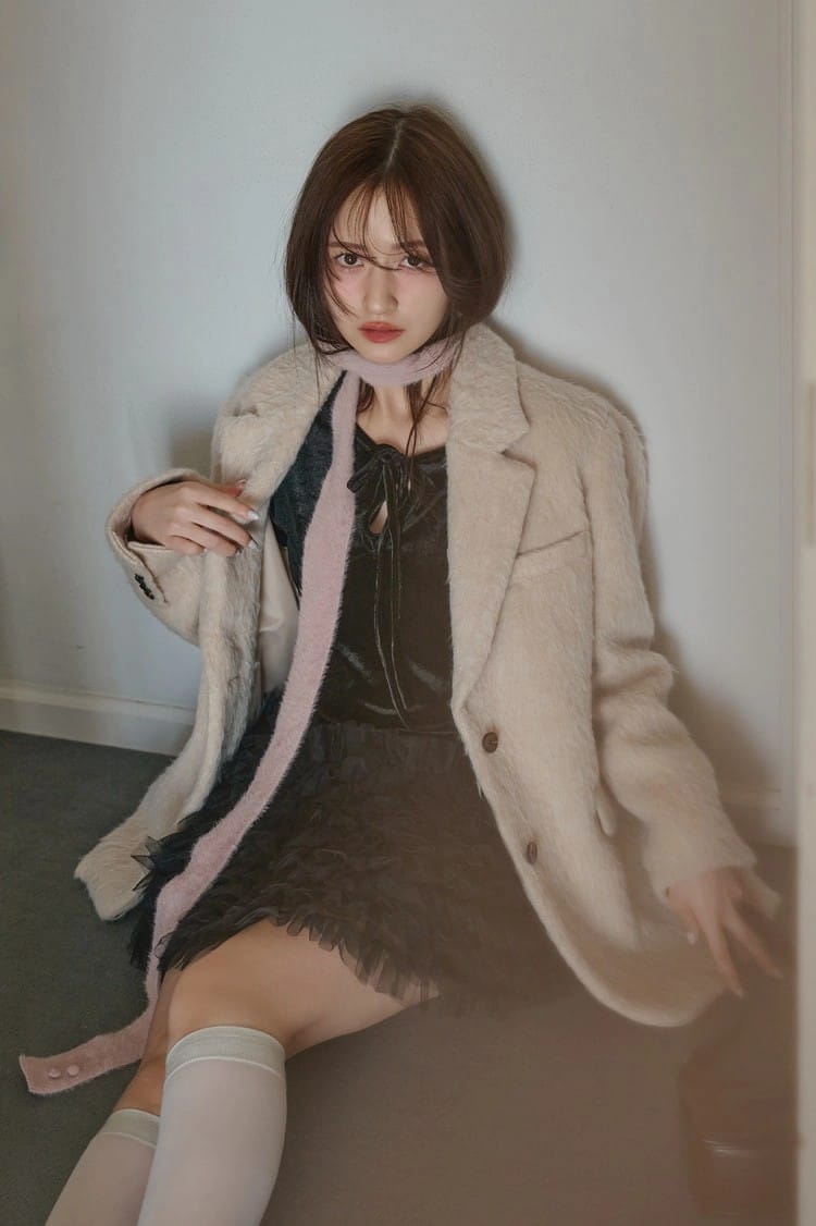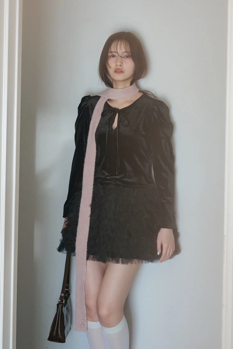 ベロアチュールワンピース 27,500円/HONEY MI HONEY 細マフラー 5,600円/ILLIGO(HANA SHOWROOM)バッグ 19,360円/CHRISTINE PROJECT(HANA KOREA)ソックス/スタイリスト私物
