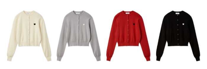 ecoハートニットカーディガンは14,300円、IVR・GRY・RED・BLKの4色展開、サイズはF。