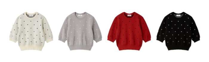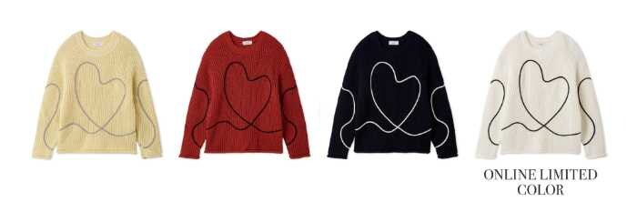 ハートエンブロイダリーニットは19,800円、YEL・RED・NVY・OWHT(ONLINE限定)の4色でサイズF。さりげない刺繍が大人可愛い印象に。