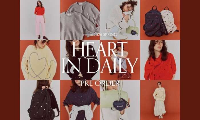 emmiから、毎日のスタイルにときめきを添えてくれるハートモチーフコレクション「HEART IN DAILY」が登場します。1月29日(木)正午より、オンラインで先行予約がスタート。ニットやシャツ、バッグ、小物まで、emmiらしい洗練と遊び心が詰まったラインナップが揃います。さらに【emmi×PUMA】のエクスクルーシブモデルも同時予約開始。春のおしゃれを一歩先取りできる注目コレクションです♪