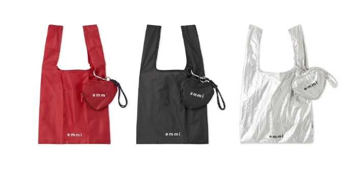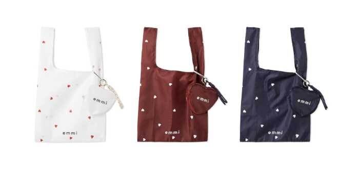 ハートチャーム付きエコバッグは5,940円、RED・NVY・SLVの3色で展開されます。