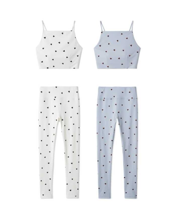 アクティブシーンにもハートを取り入れたい方には、ハートパターンブラトップとレギンスがおすすめ。ブラトップは9,680円、レギンスは10,780円で、どちらもOWHT・LBLUの2色、サイズは0・1展開です。