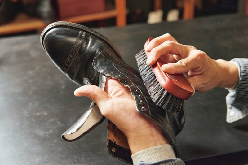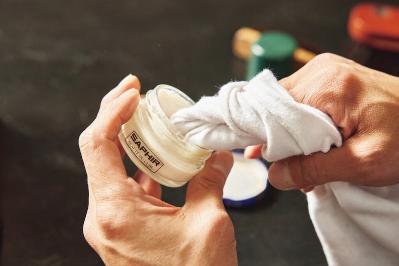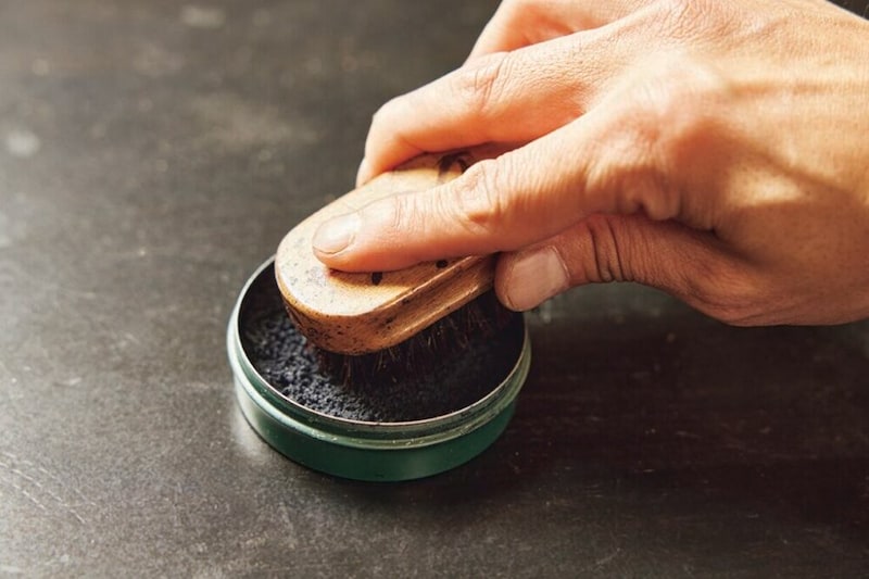 ツヤ出しのためにワックスを直接ブラシにとって磨く。ナチュラルカラーだと成分の蝋が白く噴き出てしまうこともあるので黒には黒がおすすめ。