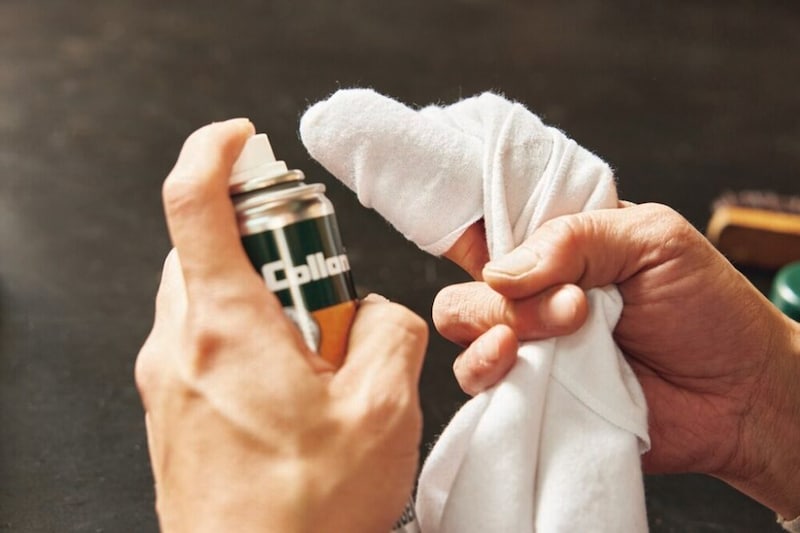 クレンジングスプレーを少量ずつ布にとり、前回のクリームやワックスを落としていく。これにより汚れの蓄積を防ぎ、オイルの浸透を促す。