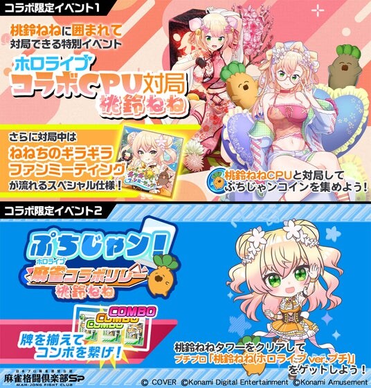 株式会社コナミアミューズメントは、モバイルゲーム『麻雀格闘倶楽部Sp(マージャンファイトクラブエスピー)』にて、カバー株式会社が運営する女性VTuberグループ「ホロライブ」所属の『桃鈴ねね(ももすずねね)』とのコラボイベント「ホロライブ麻雀コラボリレー 桃鈴ねね」を9月29日(月)から開催することをお知らせします。