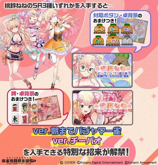 さらに、「桃鈴ねねプチプロ【SR】」のいずれかのプチプロを入手すると、『桃鈴ねね』の「ver.朝までパジャマー雀」および「ver.チーパオ」プチプロを入手できる10連招来が解禁されます。各招来の初回実施時には、卓背景をはじめとしたアレンジアイテムが特典として付属します。