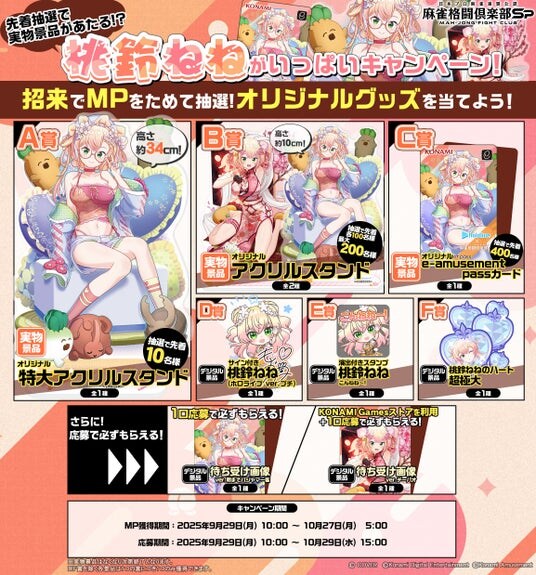 先着で高さ約34cmの『桃鈴ねね』の「オリジナル特大アクリルスタンド」や2種類の絵柄の「オリジナルアクリルスタンド」や「オリジナルe-amusement passカード」が獲得できるほか、抽選でゲーム内