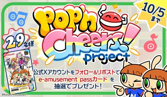 さらに、「pop'n music」公式X(@popn_team)にて、プロジェクト始動投稿をリポストした方の中から抽選で29名さまに特製「e-amusement passカード」があたる「pop’n Cheers! project公開記念 フォロー&リポストキャンペーン」も実施します。