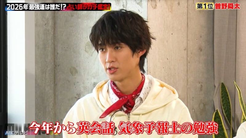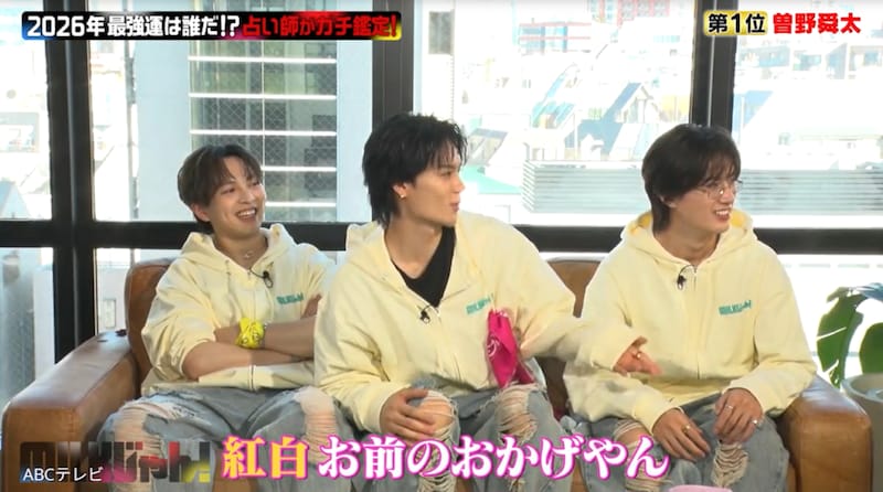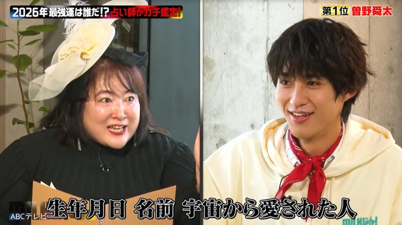 イヴルルド氏によると曽野には、「去年の11月から24年に一度の大大大大大運命の予告がスタートしております」とのこと。この鑑定に曽野は、「すごい忙しくなって、ありがたいことに夢だってどんどん紅白とか、自分のやりたいことが叶うようになってきた」と納得。「(今年は)さらにそれが叶う年!」とイヴルルド氏が明かすと、曽野は大喜びし、他のメンバーも「じゃあ紅白お前のおかげやん!」と盛り上がった。