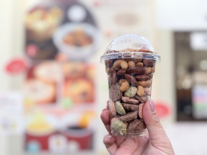 食べ出すと止まらない「焦がし&ナッツクッキー」。カシューナッツやアーモンドなどのミックスナッツと、カリッと軽い食感のクッキー。カップに入っているのでお土産にもぴったりです。