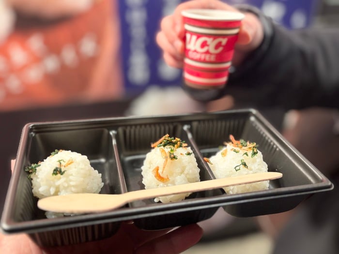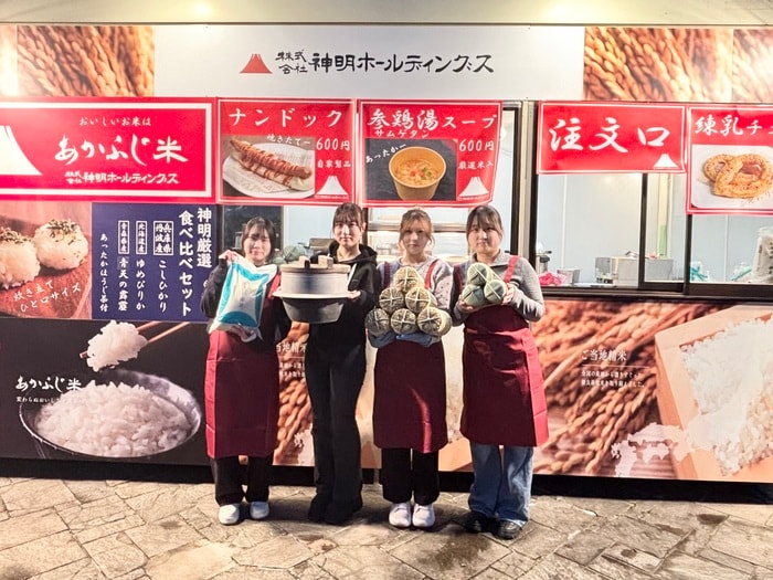 「神明厳選食べ比べセット」炊き立てのおにぎり。こしひかり・ゆめぴりか・青天の霹靂の3種類食べ比べられるお茶付きのセットは、思わず笑みが溢れます。