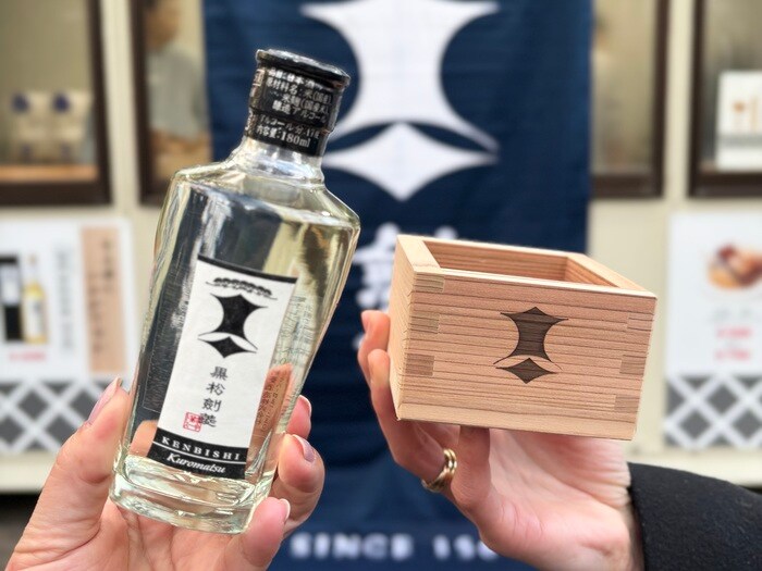 寒い冬に飲みたくなる日本酒、上品な杉マスにて提供する「樽酒黒松剣菱 杉マス」。飲み終わりは自宅での利用可能。ブースにはお土産やギフトにもぴったりな、「黒松剣菱 一合瓶」などもご用意!
