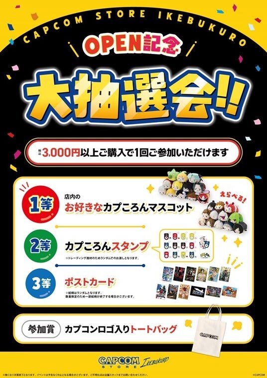 期間中、CAPCOM STORE IKEBUKURO(カプコンストアイケブクロ)店内商品を税込3,000円以上ご購入いただくと、カプコングッズが当たる抽選会にご参加いただけます。