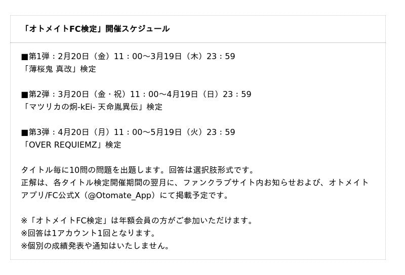 アイディアファクトリー株式会社(代表取締役社長:佐藤 嘉晃/所在地:東京都豊島区)が手掛ける女性向けゲームブランド「オトメイト」のオフィシャルファンクラブ「オトメイトファンクラブ」が、2026年2月20日に1周年を迎えることを記念して、検定イベントの実施を決定しました!