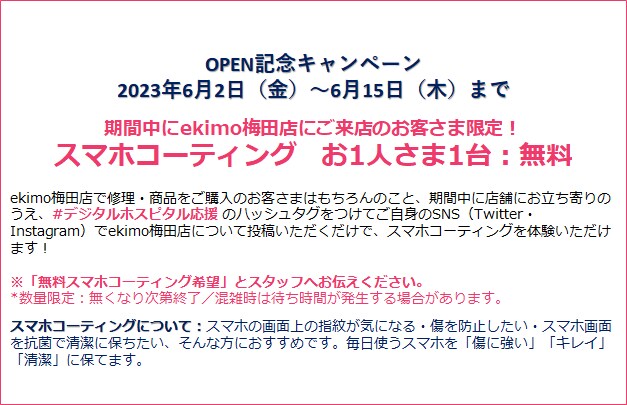 期間中にekimo梅田店にご来店のお客さま限定! スマホコーティング お1人さま1台:無料