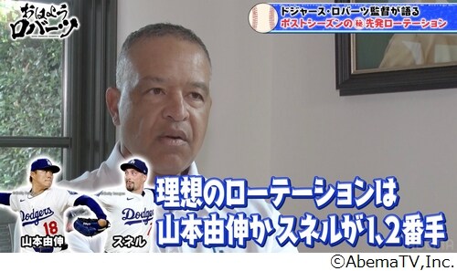 ドジャースのデーブ・ロバーツ監督(53歳)が、9月29日に放送されたスポーツ番組「おはようロバーツ」(ABEMA)に出演。ポストシーズンの“理想の先発ローテーション”について、3人の名前を挙げた。