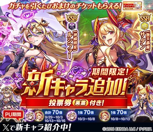 合同会社EXNOA(本社:東京都港区、CEO:村中 悠介、URL:https://games.dmm.com/ )が運営するDMM GAMESにおいて『神姫PROJECT』は、9.5周年を記念して「ルシファー」「サタン」が限定神姫として登場する事を発表した。さらに毎日最高100連のルーレットガチャや、レイドイベント「千年王国譚 堕天の双翼」が開催する。