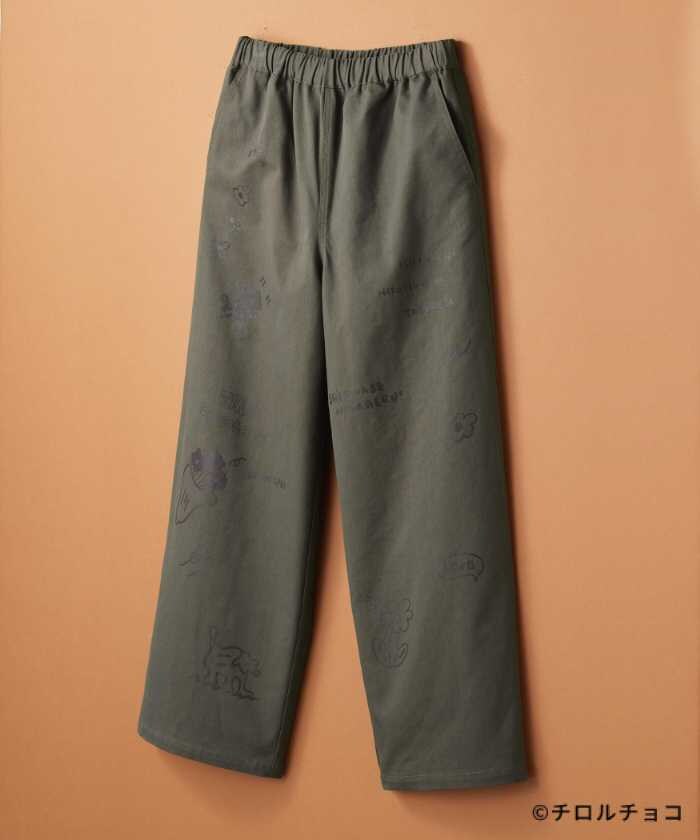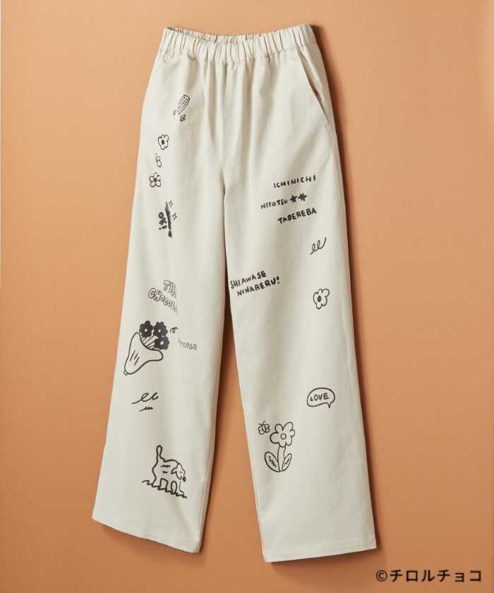【チロルチョコ×LEPSIM】イラストイージーパンツは、リラックス感のあるシルエットでデイリー使いに最適。価格は7,990円、カラーはナチュラル/スミクロ、サイズはFREE。