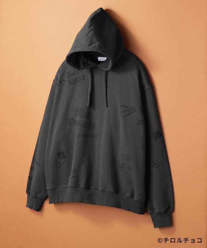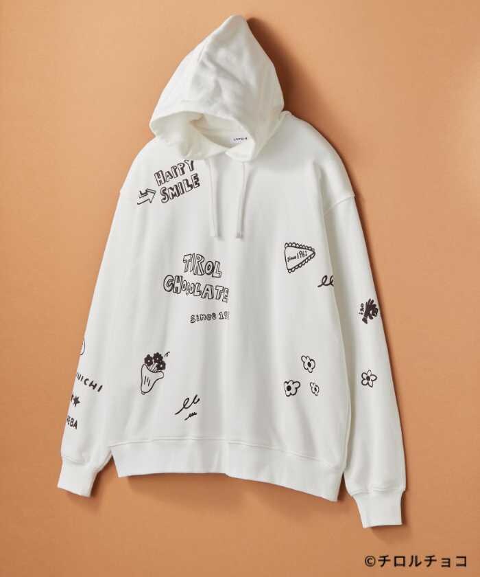 【チロルチョコ×LEPSIM】イラストBIGパーカーは、オーバーサイズでボトムを選ばず着やすい一枚。価格は5,990円、カラーはナチュラル/スミクロ、サイズはFREEです。