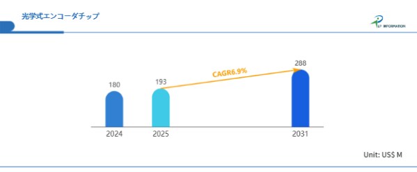 LP Information調査チームの最新レポートである「世界光学式エンコーダチップ市場の成長予測2025~2031」(https://www.lpinformation.jp/reports/113630/optical-encoder-ics)によると、2025年から2031年の予測期間中のCAGRが6.9%で、2031年までにグローバル光学式エンコーダチップ市場規模は2.88億米ドルに達すると予測されている。この背景には、産業オートメーションの進化とともに、位置検出精度のさらなる高度化が求められていることが挙げられる。AIによる生産最適化、自動搬送ロボットの精密動作制御、半導体製造装置のナノ単位位置決めなど、すべての分野で「誤差ゼロ」を目指す開発競争が進んでいる。こうした潮流の中で、光学式エンコーダチップは、単なるセンサーではなく“制御の中枢”としての戦略的価値を高めている。
