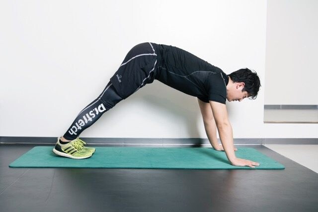 (2)2秒かけて足裏が床と垂直になるまでかかとを浮かせ、2秒かけて(1)の体勢に戻す
