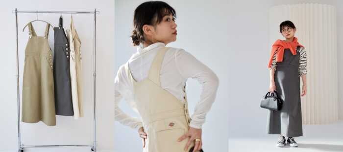 ラインアップはベイカーパンツとジャンパースカートの2型。どちらもライトベージュ、カーキ、チャコールの3色展開で、季節を問わず着回しやすいカラーが揃います。
