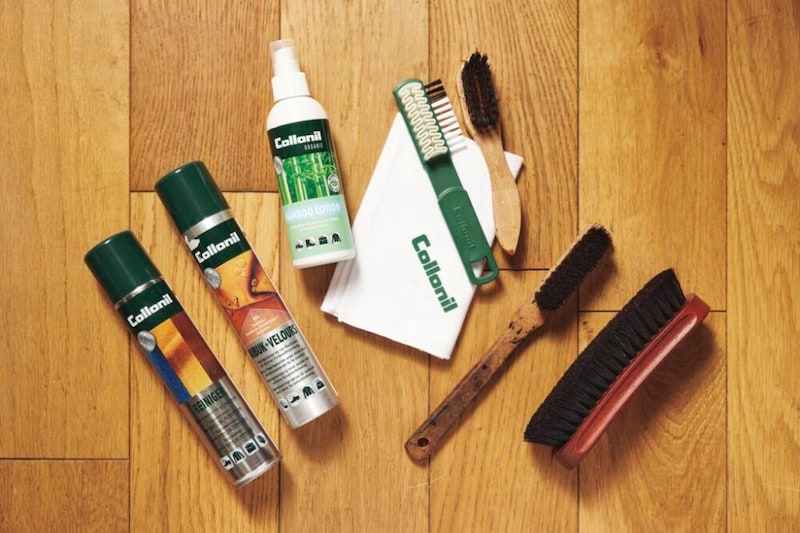 馬毛ブラシ、柄付きブラシ、金ブラシ、クレープブラシ、バンブーローション、起毛皮革用防水スプレー、クレンジングスプレー、クロス