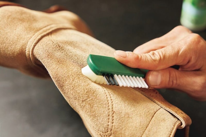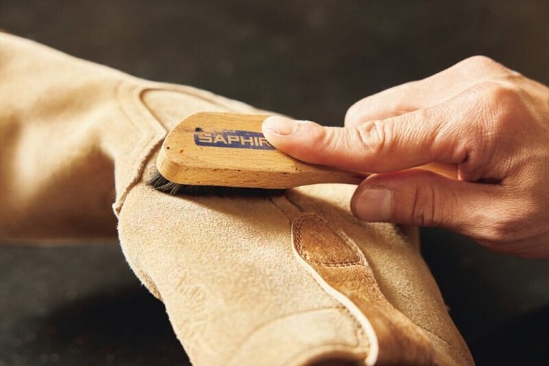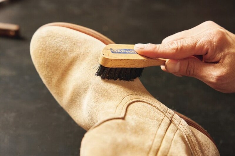 金ブラシは、毛先に適度な硬さとしなりがあり、革そのものを削りにくいためスウェードは最適。特に周りにナイロンのブラシがついたタイプは一本あれば重宝する。