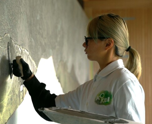 続いて、講師二人目は、井上工業でart Directorを務める奥川萌絵さん。幼少期に叔母と壁を塗った体験を原点に左官の道を志しました。仕上げに特化した高度な技術と表現力を求め、井上工業へ。左官の手仕事とアートの融合を軸に、空間と記憶に痕跡を残す表現を追求し、人の心を動かす作品制作に取り組んでいます。