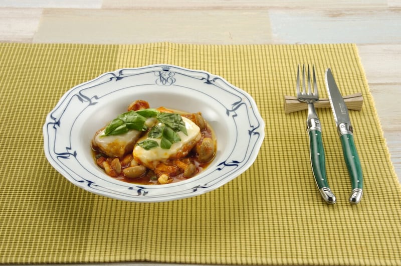 (6)器にソースと共に盛り、溶けたチーズの上にバジルをちぎってのせ、バージンオリーブ油をかける。