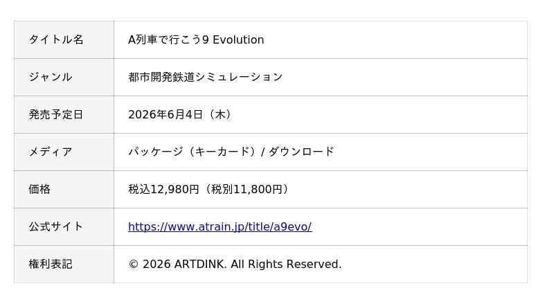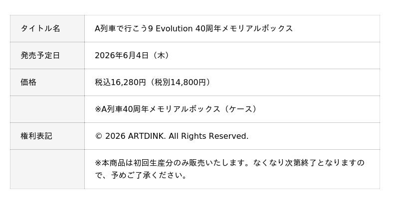 株式会社アートディンクは、Nintendo Switch(TM) 2にて「A列車で行こう9 Evolution」を2026年6月4日(木)に発売することを発表いたしました。また、40周年を記念した豪華限定版の「A列車で行こう9 Evolution 40周年メモリアルボックス」が同日発売されることも発表いたしました。