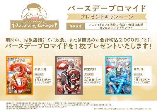 期間中、対象店舗にてご飲食、または商品のお会計2,000円(税込)ごとに、バースデーブロマイドを1枚プレゼント。