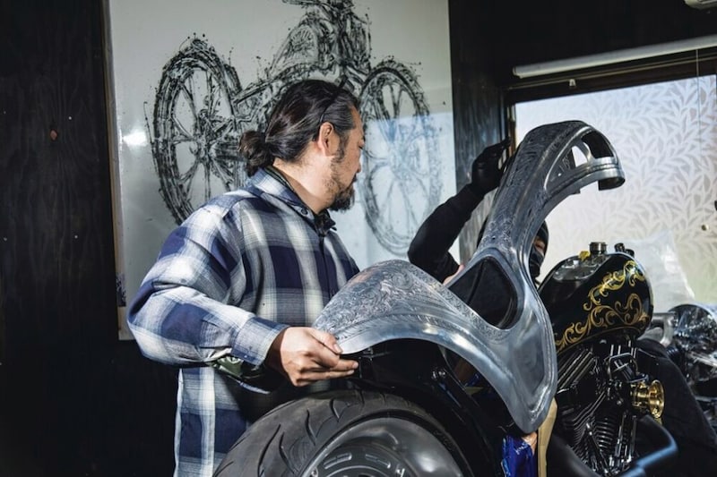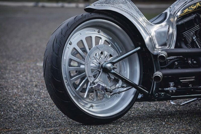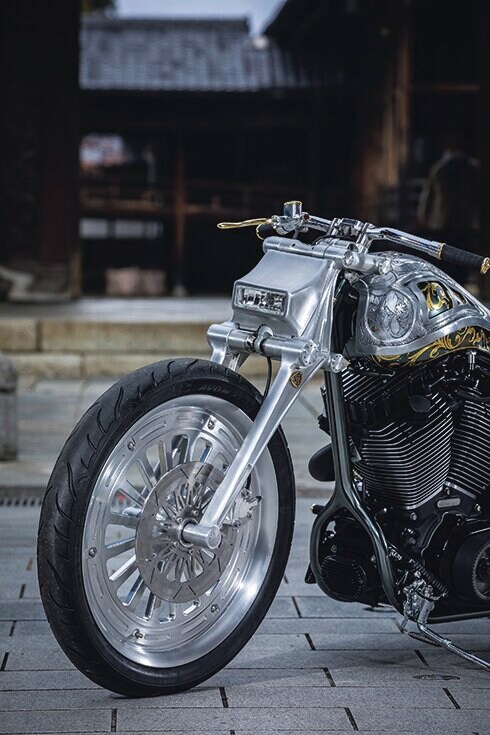 シングルクレードルのソフテイルフレームに搭載する、彫金があしらわれたアルミボディと24金リーフのインナータンクが重なり、和洋折衷を演出。ソフテイルをベースにしたのは、オーナーはこの車両が初ハーレーだったために、インジェクションモデルの安心感とカスタムの自由度の高さが決め手となった。ソフテイルとはいっても、ほぼ一から作ったカスタムメイドだが、純正フレームをシングルクレードルにモディファイしたかのような細部のデザインが見所となる。