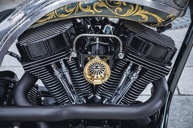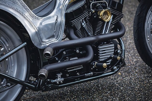 パンスタイルのロッカーカバーを装備するエンジンは2017年ソフテイルのバランサー付きツインカムにストリート用のハイカムをインストール。ブラスのヴェロシティスタックスはZONのオリジナル。