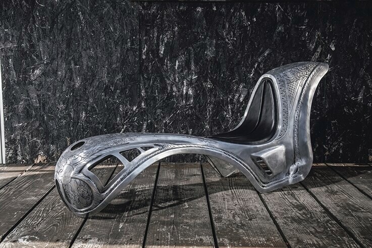3㎜厚のシートメタルをベースとして使用し、曲線や段が入り混じる立体的なハンドメイドによるカバー。リーフをイメージしたエングレイビングはシルバースミスフィンの仕事。24金リーフのインナータンクとの重なりを計算した和洋折衷のデザインが無二の存在感を演出。