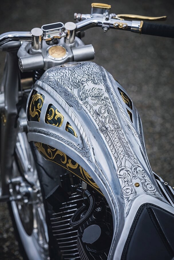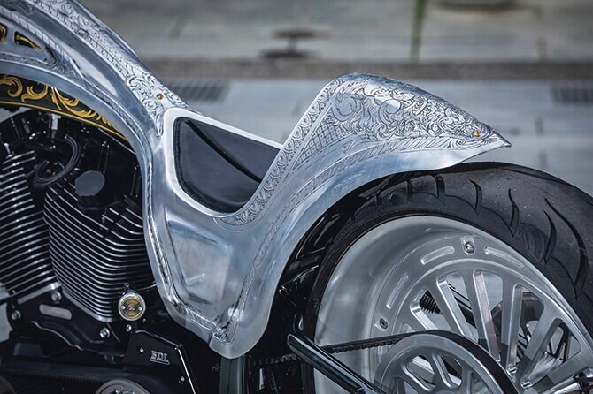 最大のアイデンティティである外装は、タンクカバーからシートカウルまでをワンピースで製作したアルミボディと24金リーフをまとったインナータンクの2層構造。アルミボディを甲冑に見立て、コンセプトを具現化した。