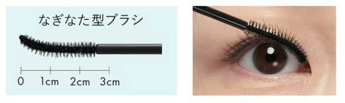 なぎなた型ブラシで目頭から目尻までしっかりキャッチ。加水分解シルク、アロエベラエキス、ホホバ油など美容保湿成分配合で、まつげをいたわりながら上品に仕上げます。