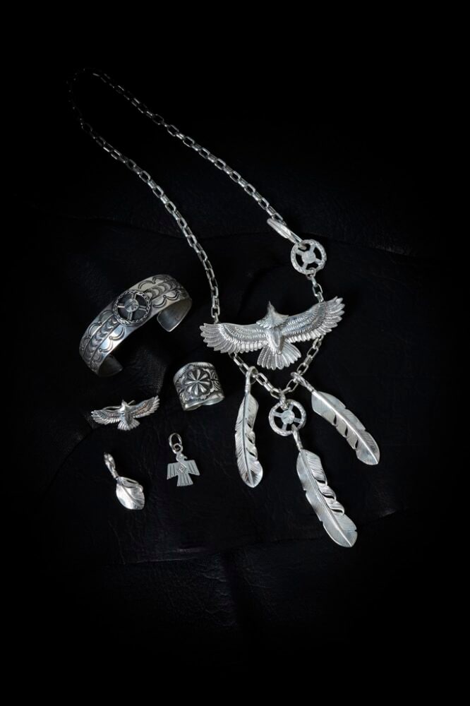そんな同ブランドの“隠れた名作”として注目したいのが、ネイティブアメリカンの意匠を採り入れたシルバージュエリー。すべて熟練職人の手仕事で作られており、ナバホ族に伝わるスタンプワークなどの伝統技法を駆使し、スターリングシルバーで一点ずつ丁寧に作られている。シルバーのラインアップは、どれもアメカジやバイカースタイルと好相性で、夏のコーディネートに絶対採り入れたい逸品ばかりだ。