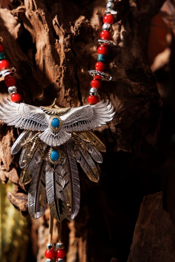 伝統的なネイティブジュエリーへの敬意に、東京のストリートのエッセンスを重ね、独自の世界観を発信する「GOD SUNS」。代表作は、“生きた造形美”を宿すイーグルペンダント。サイズごとにベビーから大イーグルまで顔つきが異なり、成長過程を表現した繊細なデザインが特徴だ。写真はイーグルを中心としたフルカスタムだが、生命力と躍動感に満ちたイーグルの造形美こそGOD SUNSの象徴なのだ。