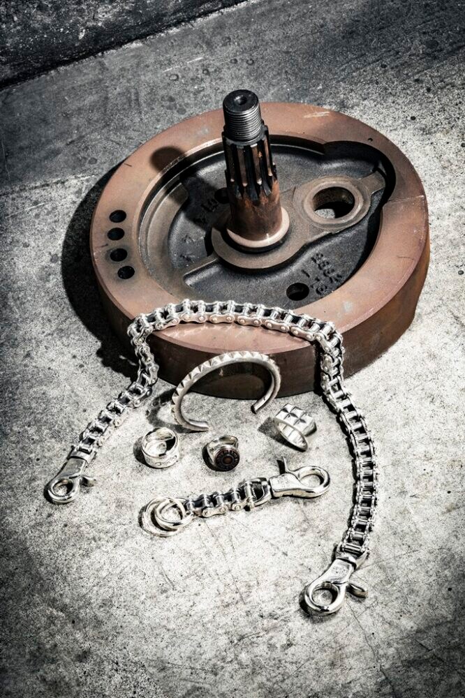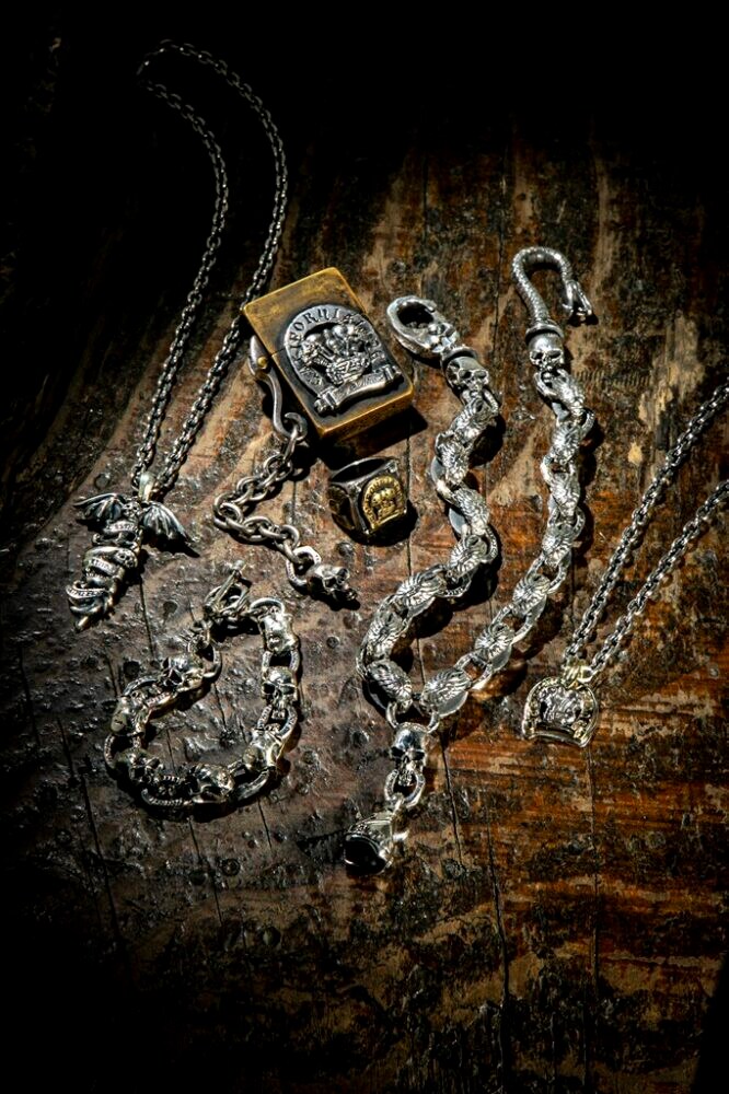 時の流れに消費されることのないオーセンティックなデザイン、長く使い込む過程を想定した質実剛健なモノ作り、それが世界中にファンを抱える「アイアンハート」のモノ作りの哲学である。看板はヘビーオンスデニムだが、その哲学はすべてのプロダクツに一貫される。シルバージュエリーも、アイアンハートの根強いコンテンツである。バイクカルチャーを背景にもつブランドだけに、パーツをモチーフとしたデザインなど、シルバーブランドとは一線を画す、カルチャー色の強さが魅力。そして、デザインはさまざまだがすべてのジュエリーに共通するのは“ゴツさ”。デニム同様、骨太なデザインかつ質実剛健なスペックこそ、バイク乗りのアクセサリーに必要な要素なのだ。