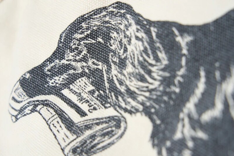 プリントは前回と同じく、新聞をくわえたアイリッシュセッター。ボディは生成り、ショルダーとポケットはアイビーリーグを思わせる深みのあるバーガンディ。アメリカのカレッジカルチャーを愛する方にぴったりのアイテムです。 デイリーユースはもちろん、コーディネートのアクセントにもおすすめ。上質な遊び心を日常に取り入れたい方へ。
