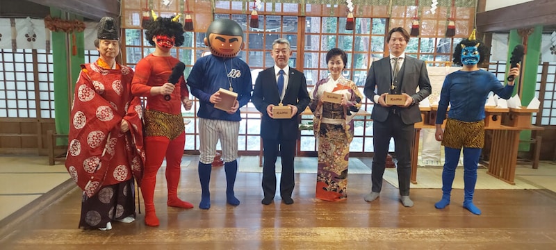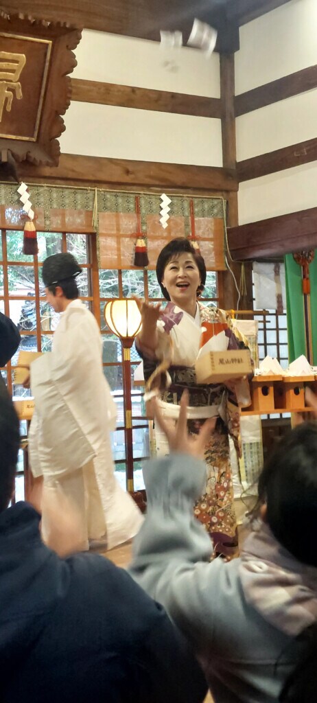 今年大雪に見舞われた金沢だが、当日は天気に恵まれ330人のファンや観光客・地元住民が訪れ、氏子と共に「鬼は外 ! 福は内 ! 」の掛け声で一斉に福豆が撒かれ多いに盛り上がった。