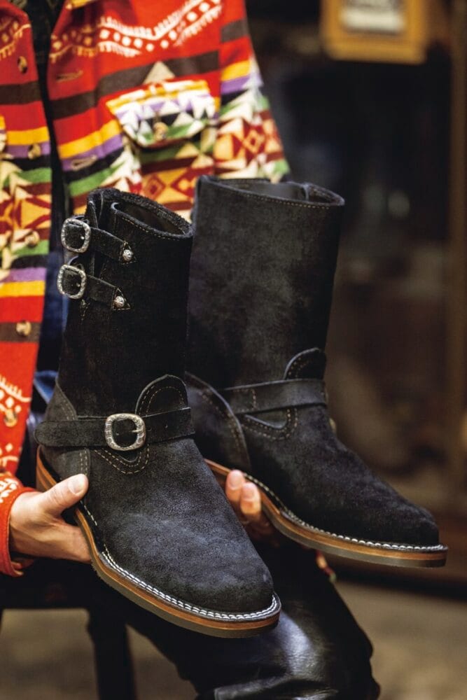 WESCOでは定番として使用されているヒール高の高いブーツ用の「9165」ラストを採用。アッパーには足馴染みが良いと人気のマテリアルであるオイルドラフアウト。シャフトを細くし、ヒールをやや高めに設定することでスタイリッシュな印象に仕上がっている。大きな特徴としては、熊谷氏のライフスタイルの一部となっているヴィンテージナバホから着想を得たバックルデザイン。ベルトの長さも上が2インチ、下が1インチと長めに設定。¥490,000_
