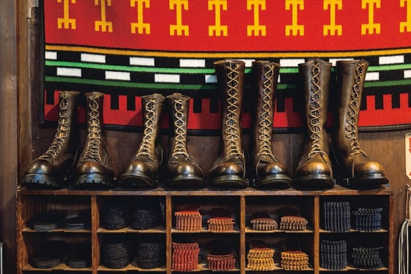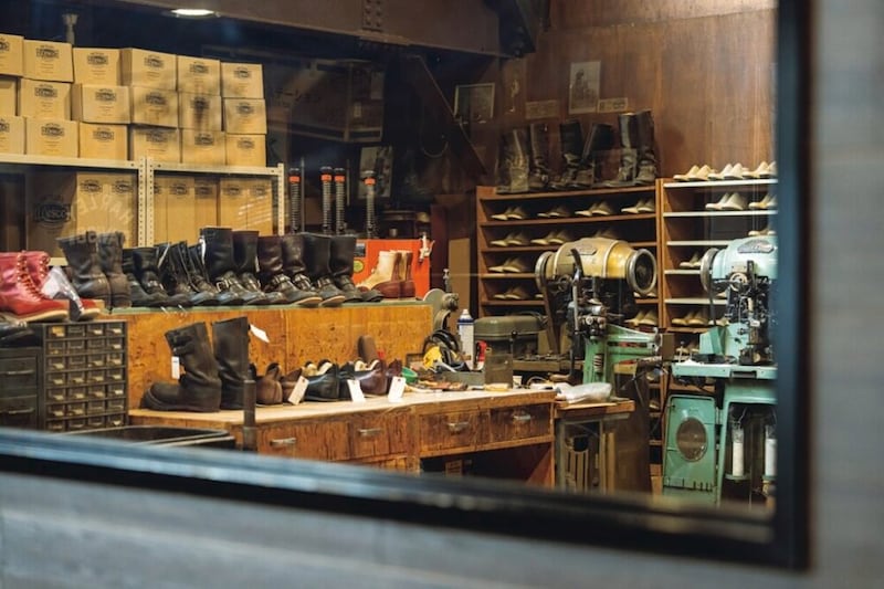 店内奥のウィンドウ越しに見えるのは、ブーツのリペア工房。ソール交換など、リペアを希望するブーツたちが全国からここに集まってくる。