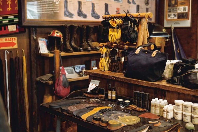 オーダーブーツのパーツだけでなく、メインテナンスグッズや国内外から仕入れた日常的に使用できるバッグやグローブなど小物も充実している。