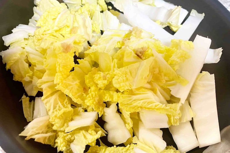 白菜は2cm幅にざく切りにする。厚揚げも8等分ほどの食べやすい大きさに切っておこう。卵は溶いておく。