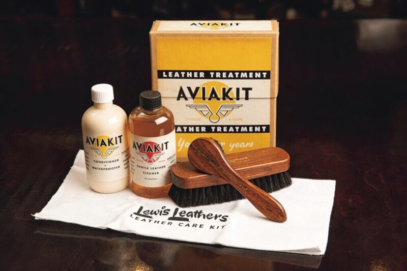 ルイスレザーズが展開するオリジナルのレザーケアキットのデラックス版19,800円(ルイスレザーズジャパンTel.03-6438-9215)コンディショナー&防水クリーム、レザークリーナー、ブラシ(大)、ブラシ(小)、クロス