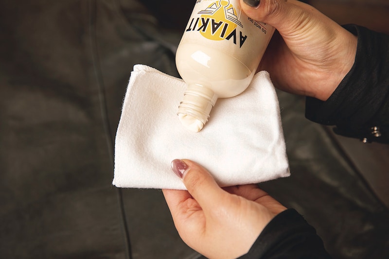 埃を落としたら、レザーに付着した汚れをクリーナーで取っていく。レザーによってはクリーナーがシミになる可能性もあるので、目立たない箇所で確認を。ゴシゴシするのでなく、丁寧に拭き取っていくイメージで。
