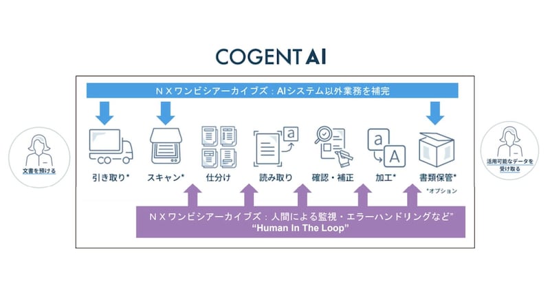 今回のサービスではAIシステムをコージェントラボが提供し、NXワンビシアーカイブズがそれ以外の業務を補完する。